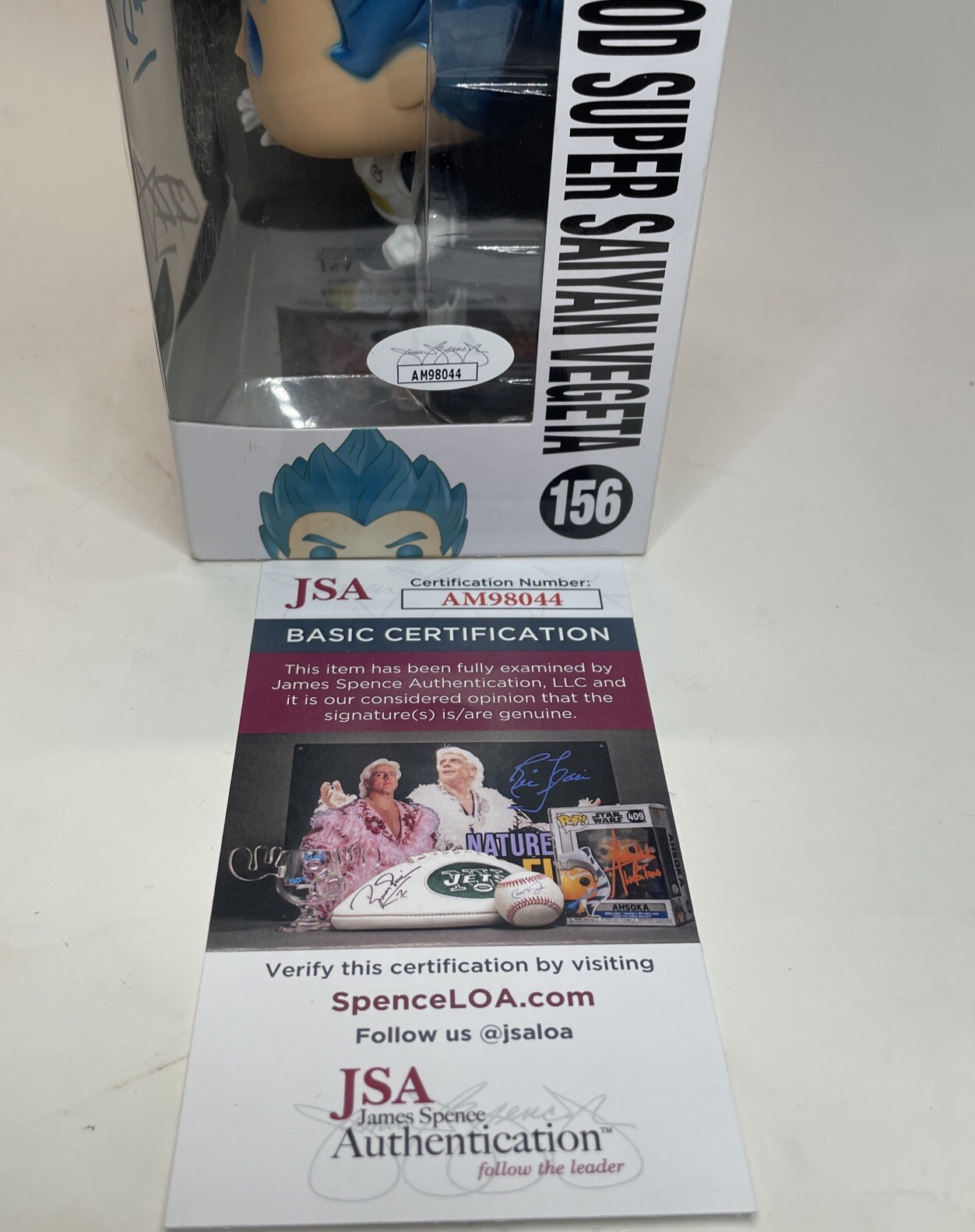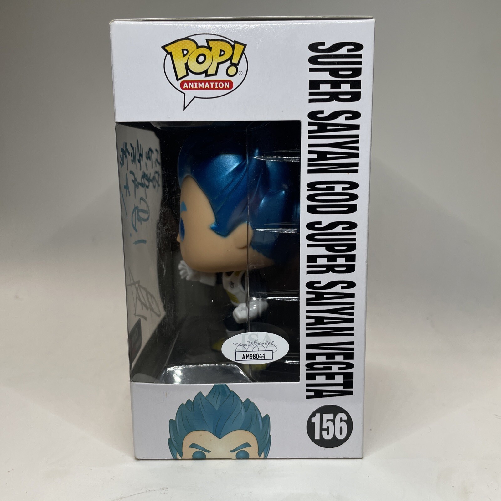 Christopher Sabat has personally autographed this limited edition SS God SS Vegeta Funko #156 figure, making it a must-have for any Dragon Ball Z fan. Exclusively available at GameStop, this Super-sized blue vinyl collectible features Vegeta in his powerful Super Saiyan God Super Saiyan form. Authenticated by Professional Sports Authenticator (PSA) with the authentication number AM90171, this Funko figure is a unique addition to any collection.